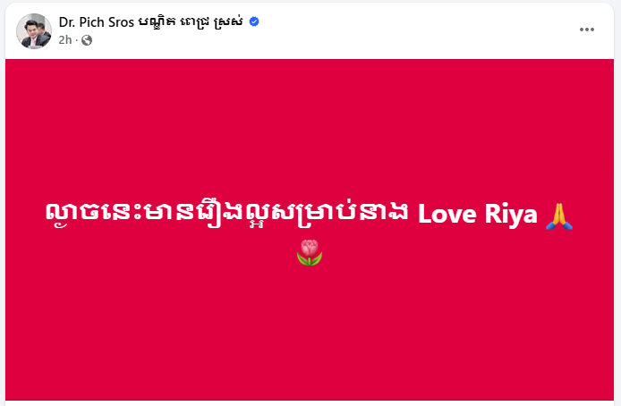 នៅថ្ងៃទី ២៤ ខែកុម្ភៈ បណ្ឌិត ពេជ្រ ស្រស់ បានបង្ហោះសារលើបណ្តាញសង្គម បញ្ជាក់ថា «ល្ងាចនេះមានរឿងល្អសម្រាប់នាង Love Riya» បន្ទាប់ពីលោកបានស្នើសុំក្តីមេត្តាពីថ្នាក់ដឹកនាំ ដើម្បីពិចារណាអនុញ្ញាតឱ្យនាងអាចនៅក្រៅឃុំជាបណ្តោះអាសន្ន។