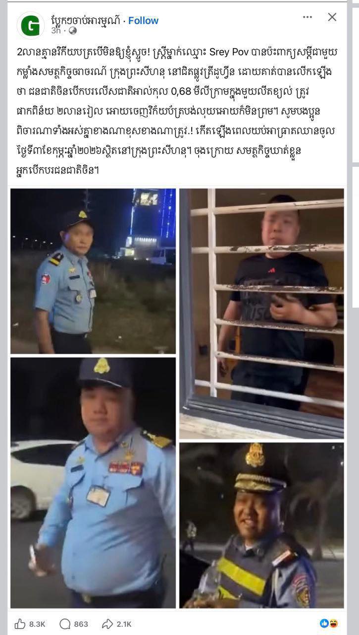 2លានគ្មានវិក័យបត្របើមិនឱ្យខ្ញុំស្ទូច! ស្ត្រីម្នាក់ឈ្មោះ Srey Pov បានប៉ះពាក្យសម្តីជាមួយ កម្លាំងសមត្ថកិច្ចចរាចរណ៍ ក្រុងព្រះសីហនុ នៅជិតផ្លូវត្រីដូហ្វីន ដោយគាត់បានលើកឡើងថា ជនជាតិចិនបើកបរលើសជាតិអាល់កុល 0,68 មីលីក្រាមក្នុងមួយលីតខ្យល់ ត្រូវផាកពិន័យ ២លានរៀល អោយចេញវិក័យប័ត្របង់លុយអោយក៏មិនព្រម។ សូមបងប្អូន ពិចារណាទាំងអស់គ្នាខាងណាខុសខាងណាត្រូវ.! កើតឡើងពេលយប់អាធ្រាតឈានចូល ថ្ងៃទី៣ខែកុម្ភៈឆ្នាំ២០២៦ស្ថិតនៅក្រុងព្រះសីហនុ ចុងក្រោយ សមត្ថកិច្ចឃាត់ខ្លួន អ្នកបើកបរជនជាតិចិន ។