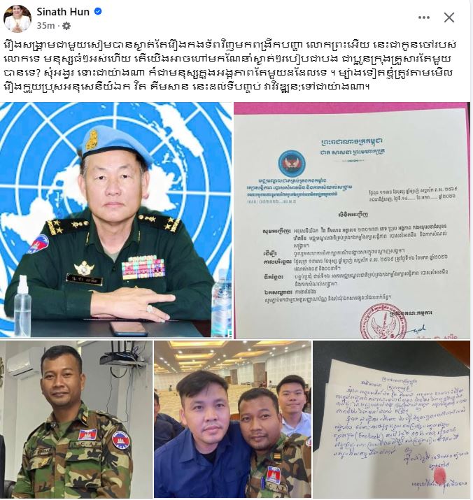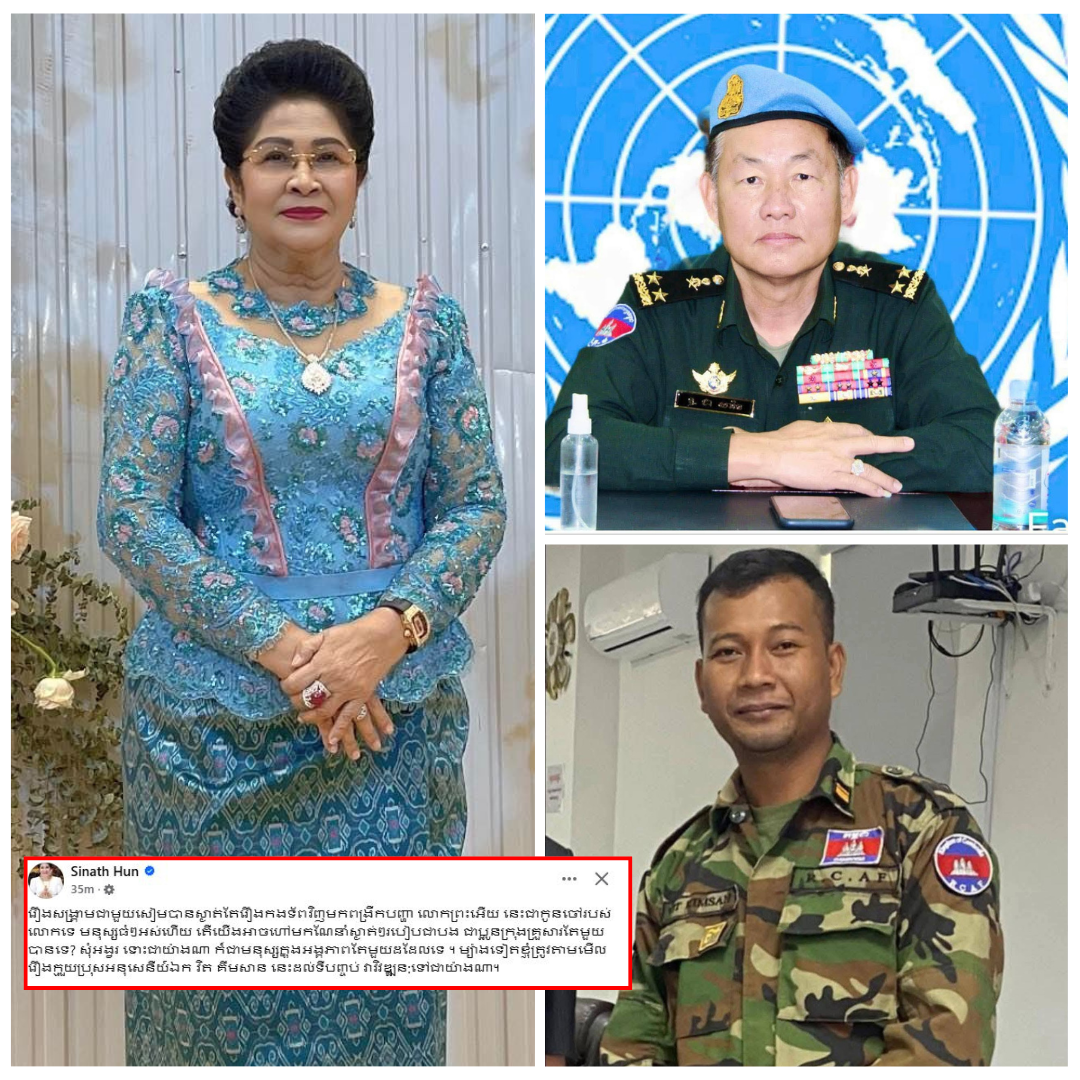 លោកជំទាវ ហ៊ុន ស៊ីណាត បានបង្ហោះសារសម្តែងការសោកស្តាយចំពោះភាពមិនចុះសម្រុងគ្នាដែលកំពុងកើតឡើងនៅក្នុងជួរកងទ័ព ដោយលោកជំទាវបានលើកឡើងថា ខណៈដែលរឿងរ៉ាវនៅព្រំដែន (សៀម) បានស្ងប់ស្ងាត់ បែរជាមានបញ្ហាផ្ទៃក្នុងកងទ័ពផ្ទុះឡើងទៅវិញ។
