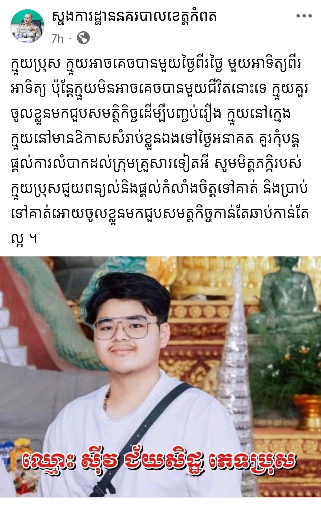 (ខេត្តកំពត)៖ ស្នងការដ្ឋាននគរបាលខេត្តកំពត បានផ្ញើសារអប់រំ និងដាស់តឿនយ៉ាងម៉ឺងម៉ាត់ ប៉ុន្តែក៏បង្កប់ដោយក្តីមេត្តាដល់យុវជនម្នាក់ដែលកំពុងរត់គេចខ្លួនពីសំណាញ់ច្បាប់ ឱ្យប្រញាប់ចូលខ្លួនមកជួបសមត្ថកិច្ច ដើម្បីដោះស្រាយបញ្ហាឱ្យបានឆាប់រហ័ស។